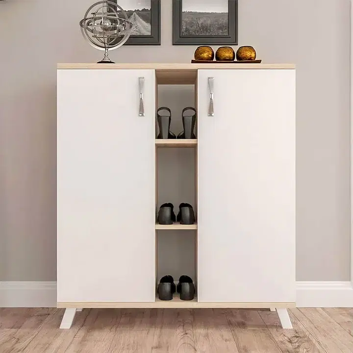 تتكون الخزانة من ضلفتين مع أرفف داخلية تساعد على ترتيب الأحذية بطريقة منظمة وسهلة الوصول، مما يحافظ على نظافة وترتيب المساحة المحيطة.