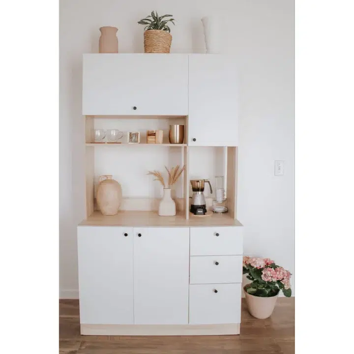 صنع ركن القهوة من خشب سويدي عالي الجودة يضمن المتانة والاستدامة لفترة طويلة، بينما تمنح الألوان المحايدة (الأبيض ودرجات الخشب الطبيعية) مرونة كاملة لدمج الوحدة مع أي ديكور داخلي، سواء كان عصريًا أو كلاسيكيًا.