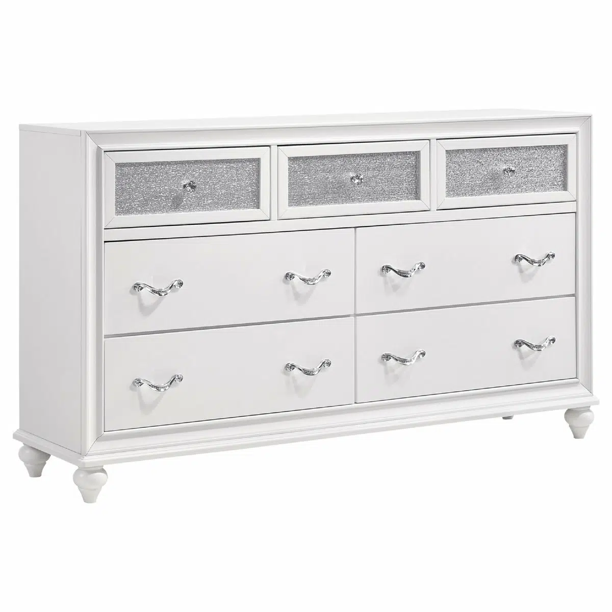 واجهات الأدراج العلوية تتميز بلمسة لامعة محفورة تضيف عمقًا بصريًا أنيقًا، مع مقابض كروم عصرية تعكس الإضاءة وتكمل المظهر الفاخر.