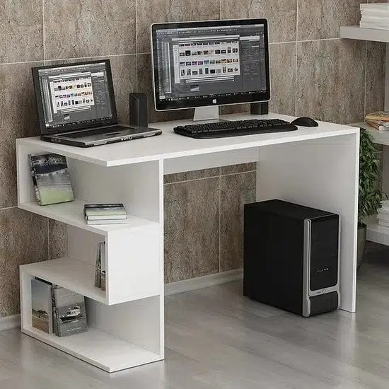 يوفر المكتب سطح عمل مريحًا يسمح بترتيب الحاسوب المحمول والكتب والأدوات اليومية بشكل منظم، كما يحتوي على رفوف جانبية عملية تساعد في تخزين الكتب أو الإكسسوارات، مما يحافظ على ترتيب المساحة ويقلل من الفوضى.